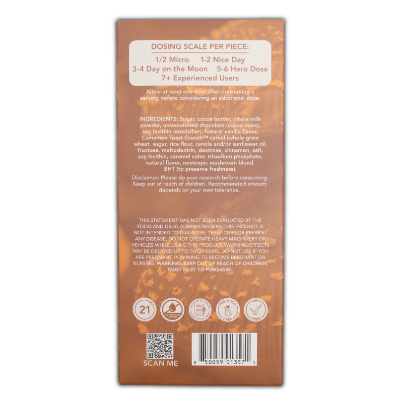 Cinnamon Toast Crunch Chocolate- Sugar, Cocoa Butter, Whole Milk Powder, Unsweetened Chocolate (Cocoa Mass), Soy Lecithin (emulsifier), Natural Vanilla Flavor, Cinnamon Toast Crunch Cereal (Whole Grain Wheat, Sugar, Rice Flour, Canola and/or Sunflower Oil, Fructose, Maltodextrin, Dextrose, Cinnamon, Salt, Soy Lecithin, Caramel Color, Trisodium Phosphate, Natural Flavor, Nootropic Mushroom Blend, BHT (freshness). ALLERGENS: Contains Milk, Soy, Wheat.