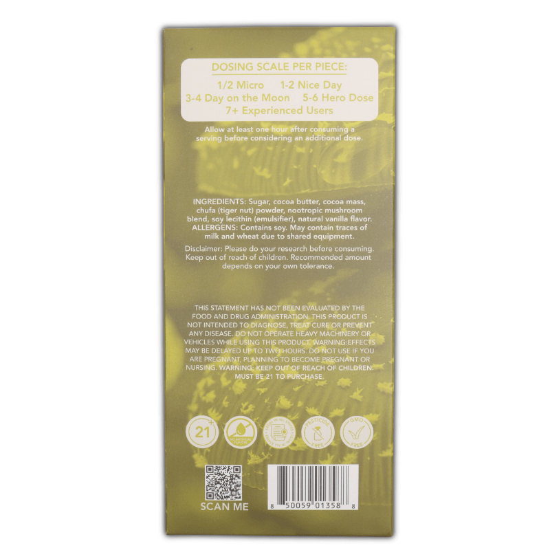 Vegan Milk Chocolate- Sugar, Cocoa Butter, Cocoa Mass, Chufa (Tiger Nut) Powder, Nootropic Mushroom Blend, Soy Lecithin (emulsifier), Natural Vanilla Flavor. ALLERGENS: Contains Soy. May contain traces of milk and wheat due to shared equipment.
