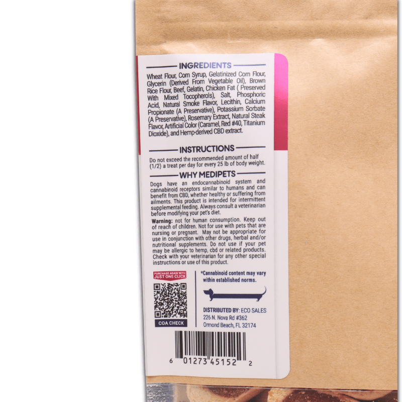 Wheat Flour, Corn Syrup, Gelatinized Corn Flour, Glycerin (Derived From Vegetable Oil), Brown Rice Flour, Beef, Gelatin, Chicken Fat (Preserved With Mixed Tocopherols), Salt, Phosphoric Acid, Natural Smoke Flavor, Lecithin, Calcium Propionate (A Preservative), Potassium Sorbate (A Preservative), Rosemary Extract, Natural Steak Flavor, Artificial Color (Caramel, Red #40, Titanium Dioxide), and Hemp-Derived CBD Extract.