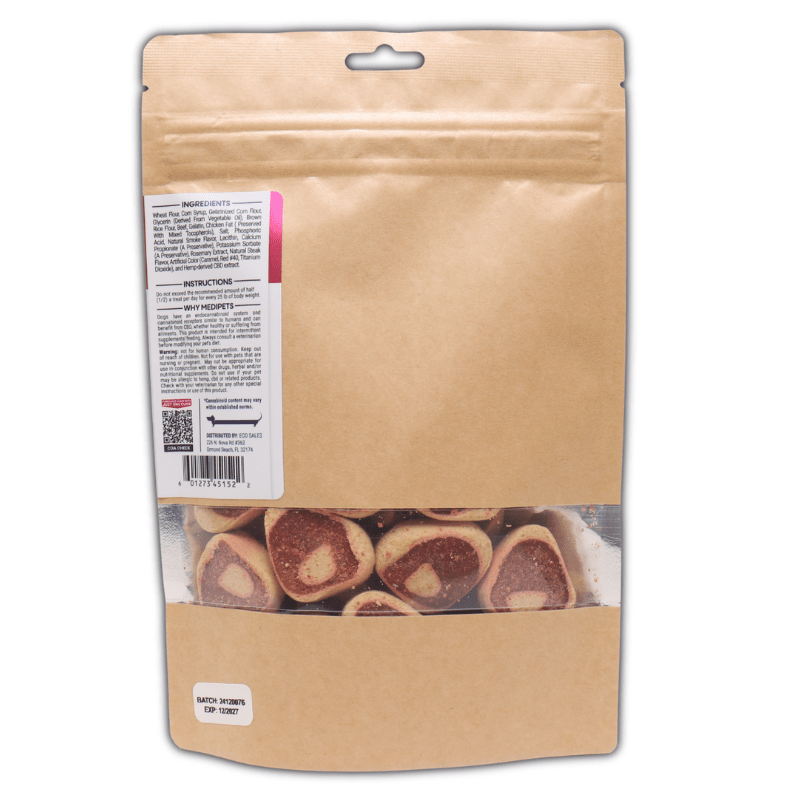 Perfect for training rewards or everyday comfort, Curious Steak Treats help your dog stay calm during stressful moments—car rides, thunderstorms, grooming appointments—while supporting mobility and post-activity recovery. Dogs love the bold, meaty steak flavor and satisfying bite these medicinal treats have to offer. Whether you're reinforcing good behavior or simply giving your pup a moment of ease, these CBD treats make wellness delicious and convenient. A trusted choice for pet parents who want to support their dog's best life.