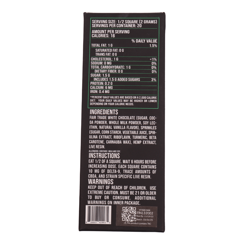 Fair Trade White Chocolate, (Sugar, Cocoa Butter, Whole Milk Powder, Soy Lecithin, Natural Vanilla Flavor), Sprinkles (Sugar, Corn Starch, Vegetable Juice, Spiraling Extract, Riboflavin, Turmeric, Beta Carotene, Carnauba Wax), Hemp Extract, Live Resin