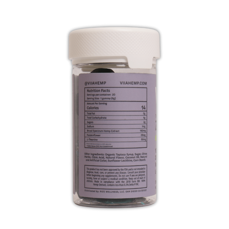 Organic Tapioca Syrup, Sugar, Citrus Pectin, Broad Spectrum CBD, L-Theanine, Passionflower, CBN Isolate, Citric Acid, Natural Flavor, Coconut Oil, Natural and Artificial Color, Sunflower Lecithins, Corn Starch.