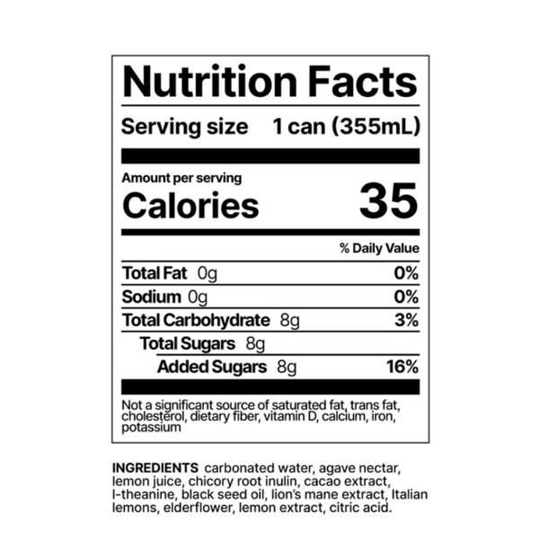 Lion's Mane extract,Β Cacao extract ,Β L-Theanine,Β Black Seed Oil,Β Carbonated water,Β Agave nectar,Β Italian lemons,Β Elderflower,Β Lemon juice,Β Citric acid (for freshness),Β Natural Flavors,Β 222 ml / 7.5 fl. oz per can